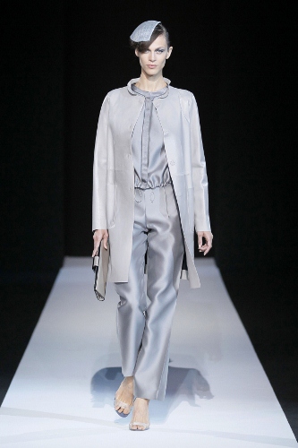 VARIATIONS, NUANCES, JUXTAPOSITIONS. THE WORLD OF ARMANI IS MULTIFACETED, AS IF OBSERVED THROUGH A KALEIDOSCOPE THAT SEPARATES, REFRACTS AND ILLUMINATES. IT IS INGENIOUS IN ITS USE OF SHAPES, FABRICS, AND ITS QUALITY OF WORKMANSHIP. SUBTLE YET PROFOUND ALTERATIONS CREATE SOFT, NATURALLY DECONSTRUCTED FITS, RENDERED FLUID THROUGH THE USE OF GOSSAMER SILK AND ORGANZA. LIGHT OVERCOATS AND SHORT, BEAUTIFULLY TAILORED JACKETS FIT LIKE A GLOVE, AND ARE PAIRED WITH FLOWING TROUSERS, MEASURED TO PERFECTION ABOVE THE ANKLE, OR SHORTS THAT SUDDENLY BRING THE LEGS INTO SIGHT. THE LOW SHOES ARE MASCULINE YET TAPERED, THE SILVER HEELS PROVIDING A SHIMMER OF LIGHT WITH EVERY STEP, WHILE THE HIGH SHOES COME WITH RHINESTONE STUDDED HEELS. BLACK, TURQUOISE AND GREY ARE THE MAIN COLORS, ACCOMPANIED BY JADE AND LIGHT BLUE SOFTENED WITH WHITE, BRIGHTENED ALSO IN DAY WEAR BY TRANSPARENT YARNS, CRYSTAL TOUCHES, AND REFLECTIONS. THE SPARKLE IS ACCENTUATED FOR THE EVENING, WITH A CONSTELLATION OF STARS ON A NAVY BLUE BACKGROUND. LIGHTNESS IS KEY, ALWAYS, AND WITH AN ADDED TOUCH OF NONCHALANCE.